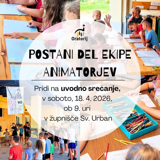 Uvodno srečanje za ORATORIJ bo v soboto, 18. 4. 2026, ob 9. uri v župnišču pri Sv. Urbanu. Mladi, lepo vabljeni. Oratorij bo od 25. 6. do 28. 6.